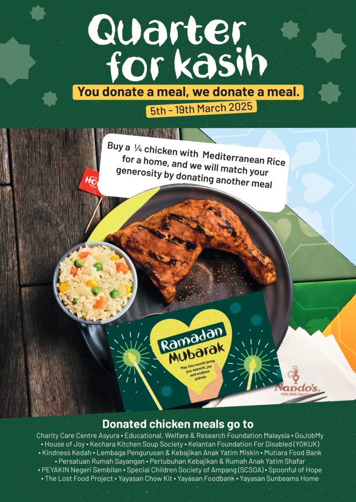 “With ‘Quarter for Kasih,’ we’re inviting everyone to make a real difference through a simple yet powerful act of sharing. This initiative is not just about providing meals; it’s about creating moments of togetherness, especially during Ramadan,” said Mac Chung Lynn, Group CEO of Nando’s Malaysia & Singapore.