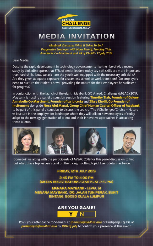 In conjunction with the launch of the eighth Maybank GO Ahead. Challenge (MGAC) 2019, Maybank is hosting a panel discussion session featuring Timothy Tiah, Founder of Colony and Annabelle Co-Martinent, Founder of La Juiceria and Zikry Kholil, Co-founder of Incitement alongside Nora Abd Manaf, Group Chief Human Capital Officer of Maybank to be part of this panel discussion to discuss the topic of The #ChallengeofChoice – Nature vs Nurture in the employment landscape where they will talk on how employers of today adapt to the new age generation of talent and their innovative approaches in attracting these talents.